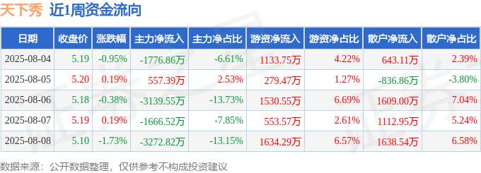 资金流向数据方面,本周天下秀主力资金合计净流出9298.36万元,游资资金合计净流入5131.62万元,散户资金合计净流入4166.74万元。本周资金流向一览见下表: