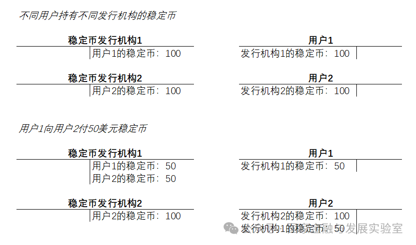 首先,图13说明,跨发行机构的稳定币转移不可行。实际上,同一发行机构在不同公有区块链上发行的稳定币在技术上也不是互联互通的。这样,稳定币存在流动性分割问题。作为类比,微信支付与支付宝之间也不能转账。
