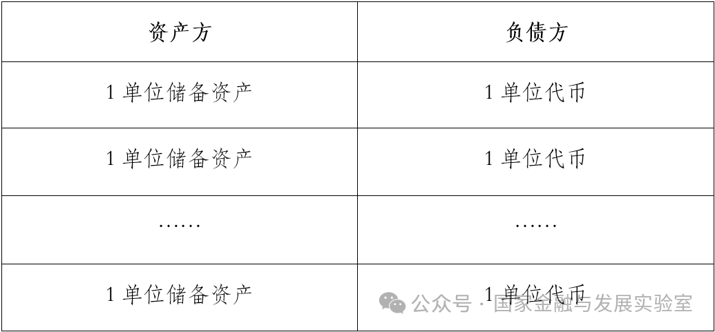 对前面列举的数字资产,在代币化过程中都离不开一个受用户信任的发行机构。发行机构基于储备资产发行代币。表2显示了发行机构的资产负债表,储备资产在资产方,代币在负债方,代币与储备资产之间是一一对应的。
