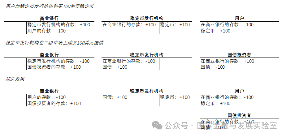 如果使用货币的严格定义,稳定币是一种在层级上低于存款的支付工具,而非货币工具。图10分析了稳定币发行对存款货币总量的影响。为分析的简便,图10假设用户、稳定币发行机构和国债投资者在同一家商业银行开立存款账户,以及稳定币储备资产投资于国债。放松这些假设不会影响图10的核心结论:稳定币发行不会影响存款货币总量;稳定币赎回作为发行的逆操作,也不会影响存款货币总量。