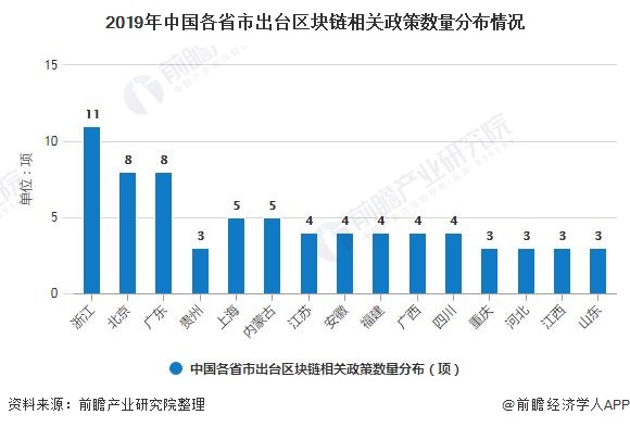 全国超过30个省市地区发布政策指导文件,开展区块链产业布局,截止至2019年底各省市已出台区块链相关政策106项,从地区分布来看,浙江省发布的政策最多,为11项,北京和广东均以8项位列第二名。目前还是以沿海以及一线地区发布政策居多,但也体现出内陆省市希望抓住区块链的发展机遇的趋势。