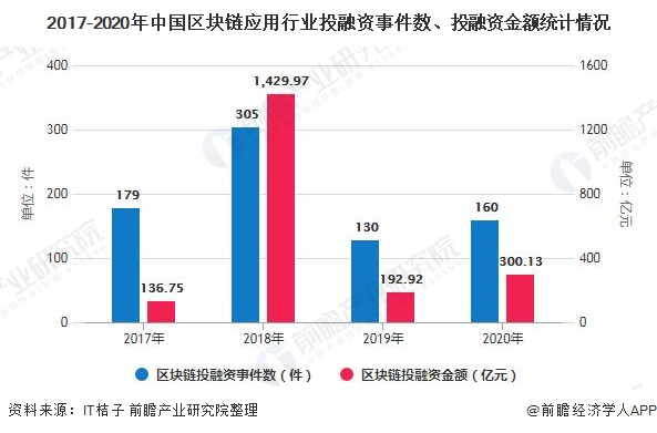 具体来看,据IT桔子,2018年全国区块链应用行业投融资达到近四年来最高,融资金额达1429.97亿元,2019年资本方对区块链公司的投资逐渐趋于理性,下降为192.92亿元,2020年稳定上涨至300.13亿元。总体而言,区块链投资趋于理性。