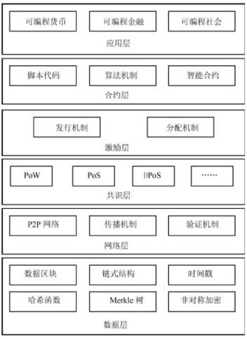一般说来,区块链系统由数据层、网络层、共识层、激励层、合约层和应用层组成。其中,数据层封装了底层数据区块以及相关的数据加密和时间戳等基础数据和基本算法;网络层则包括分布式组网机制、数据传播机制和数据验证机制等;共识层主要封装网络节点的各类共识算法;激励层将经济因素集成到区块链技术体系中来,主要包括经济激励的发行机制和分配机制等;合约层主要封装各类脚本、算法和智能合约,是区块链可编程特性的基础;应用层则封装了区块链的各种应用场景和案例。该模型中,基于时间戳的链式区块结构、分布式节点的共识机制、基于共识算力的经济激励和灵活可编程的智能合约是区块链技术最具代表性的创新点。