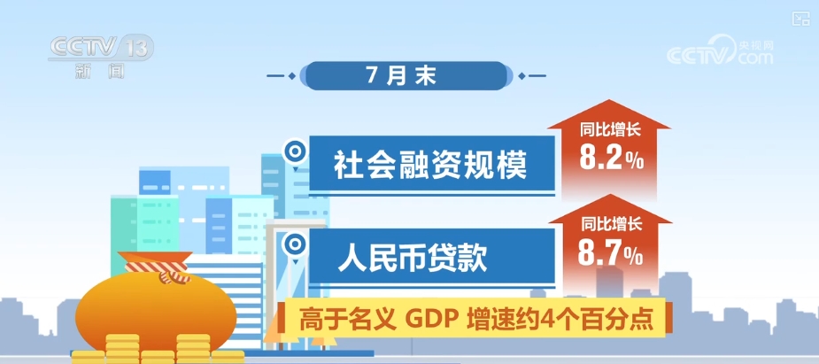 数据显示,7月末,社会融资规模同比增长8.2%,人民币贷款同比增长8.7%,高于名义GDP增速约4个百分点。新发放贷款利率平均为3.6%左右,处于历史低位。