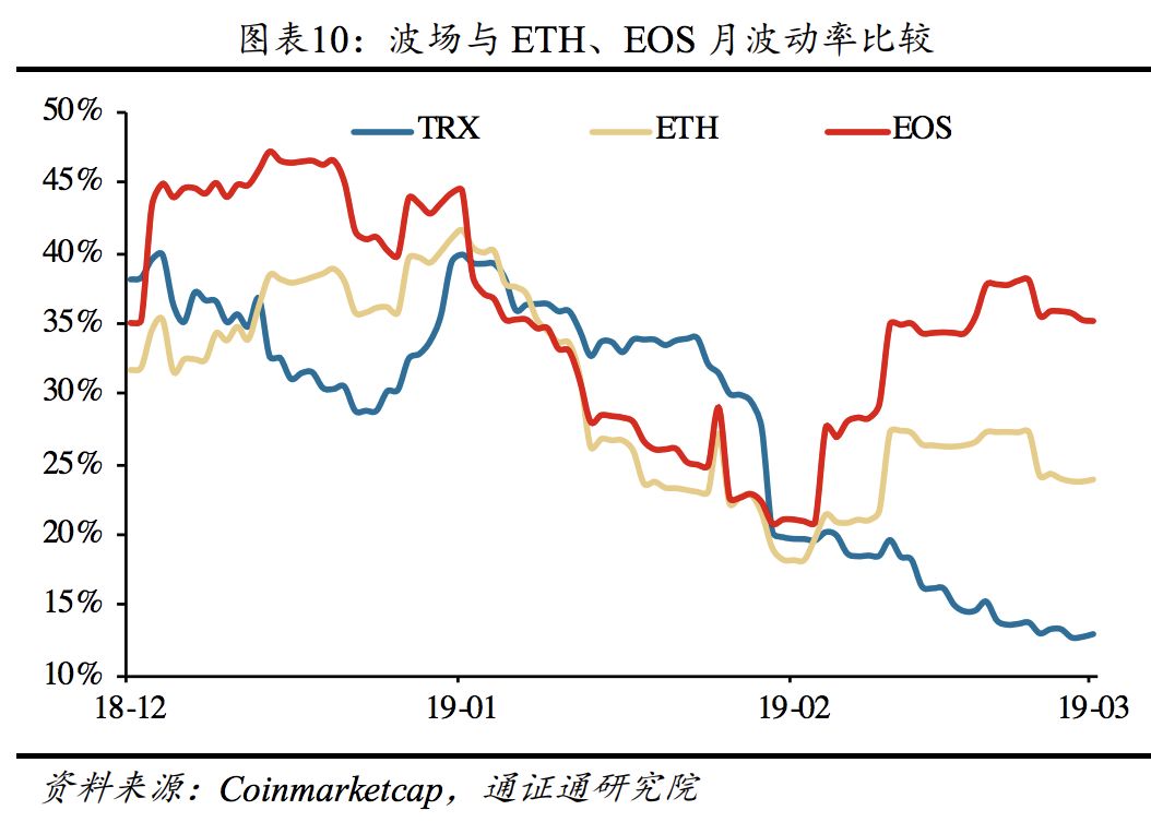 TRX的波动率近期持续走低,月波动率仅为12%左右,低于市场平均水平,其通证价值也趋于稳定。