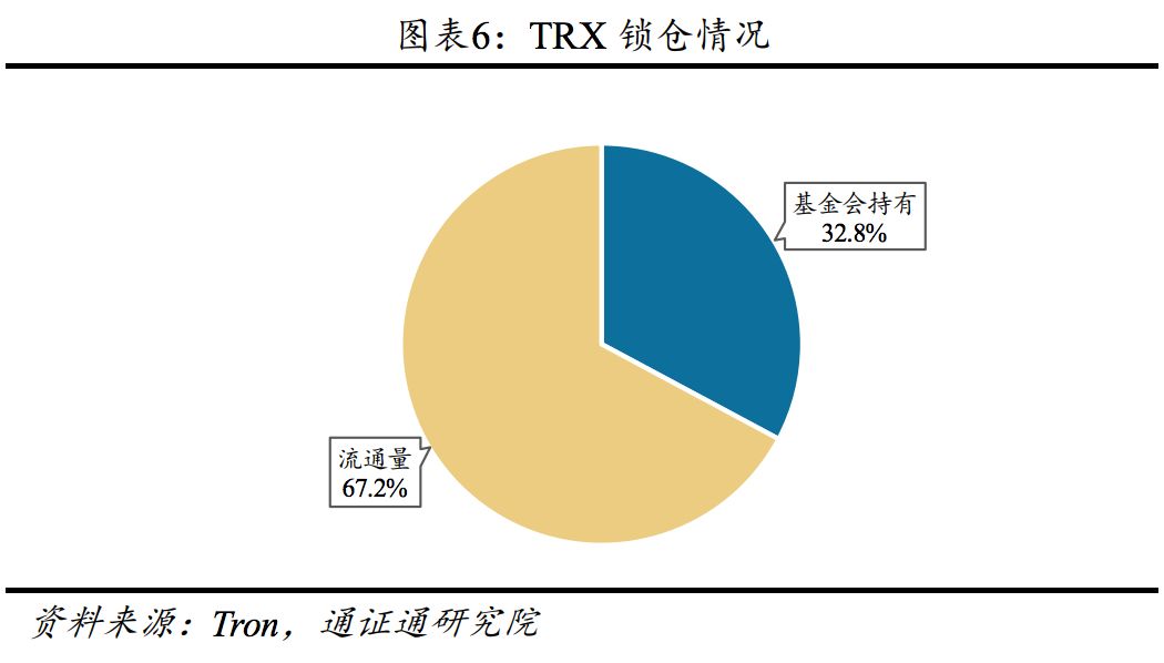 TRX总量的约三分之一被基金会锁仓。Tron基金会持有TRX总量约326亿个,占比32.8%。Tron基金会是一个非营利性组织,对资金的监管与使用计划有严谨的安排。