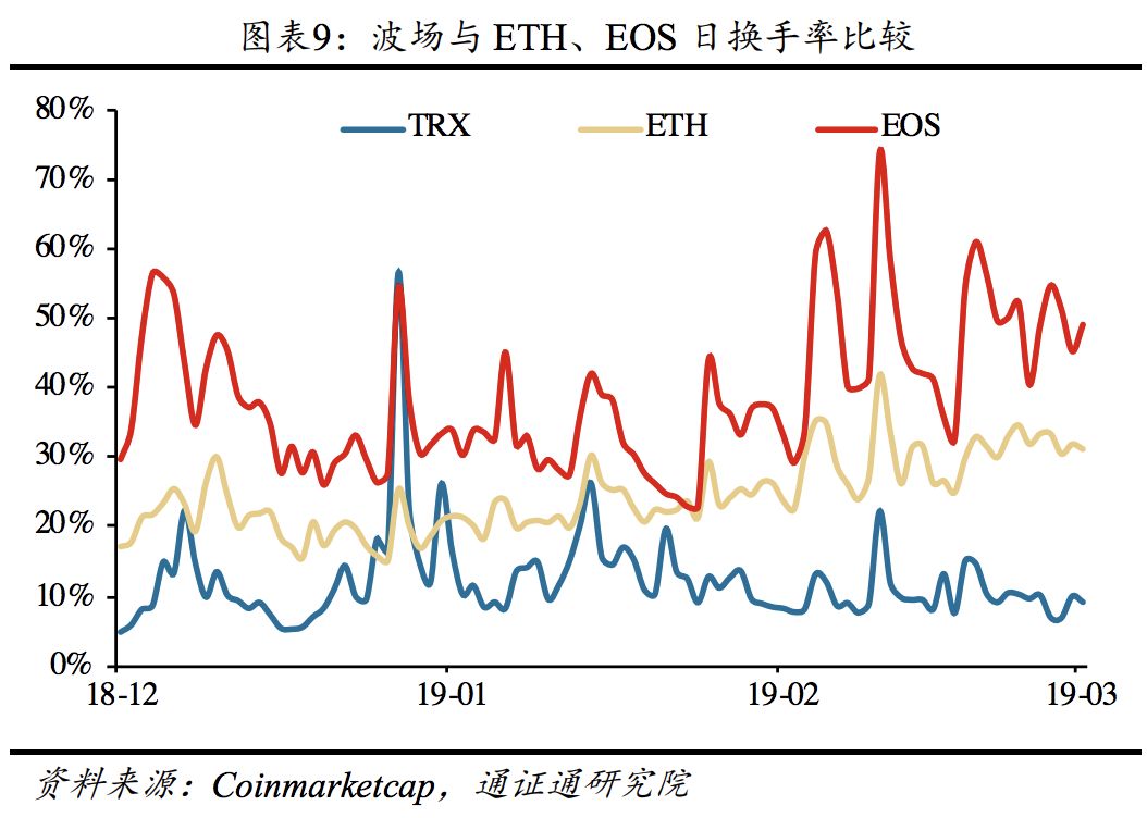 波场目前已经上线家数字通证交易所,流通市值排名第十,近一个月平均换手率为10.2%,低于EOS、ETH以及市场平均水平,流动性一般。