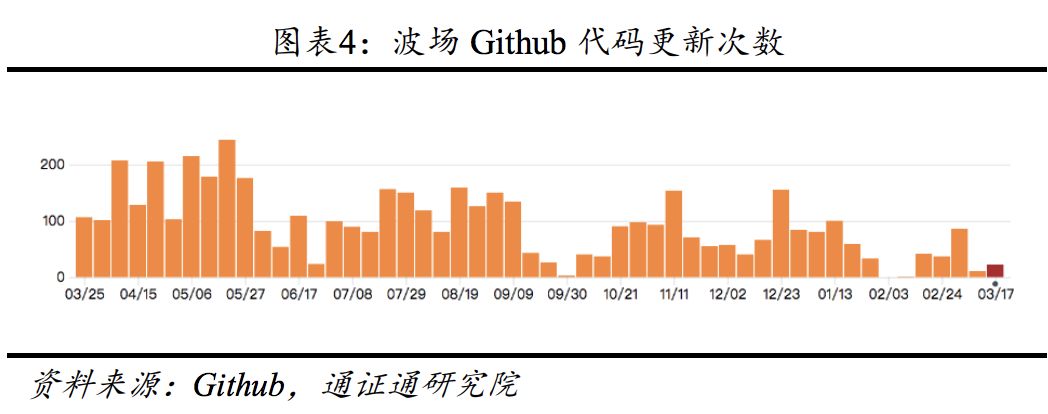 波场的主要代码在Github上开源。其主要项目库目前收获2150个Star,以及532次Fork。近一个月(2019.2.15~2019.3.15)共有19位开发者对开发分支提交了187次代码。从历史提交情况来看,波场代码的更新频率正缓慢下降。这可能是主网上线后,大规模的开发已经结束造成的。