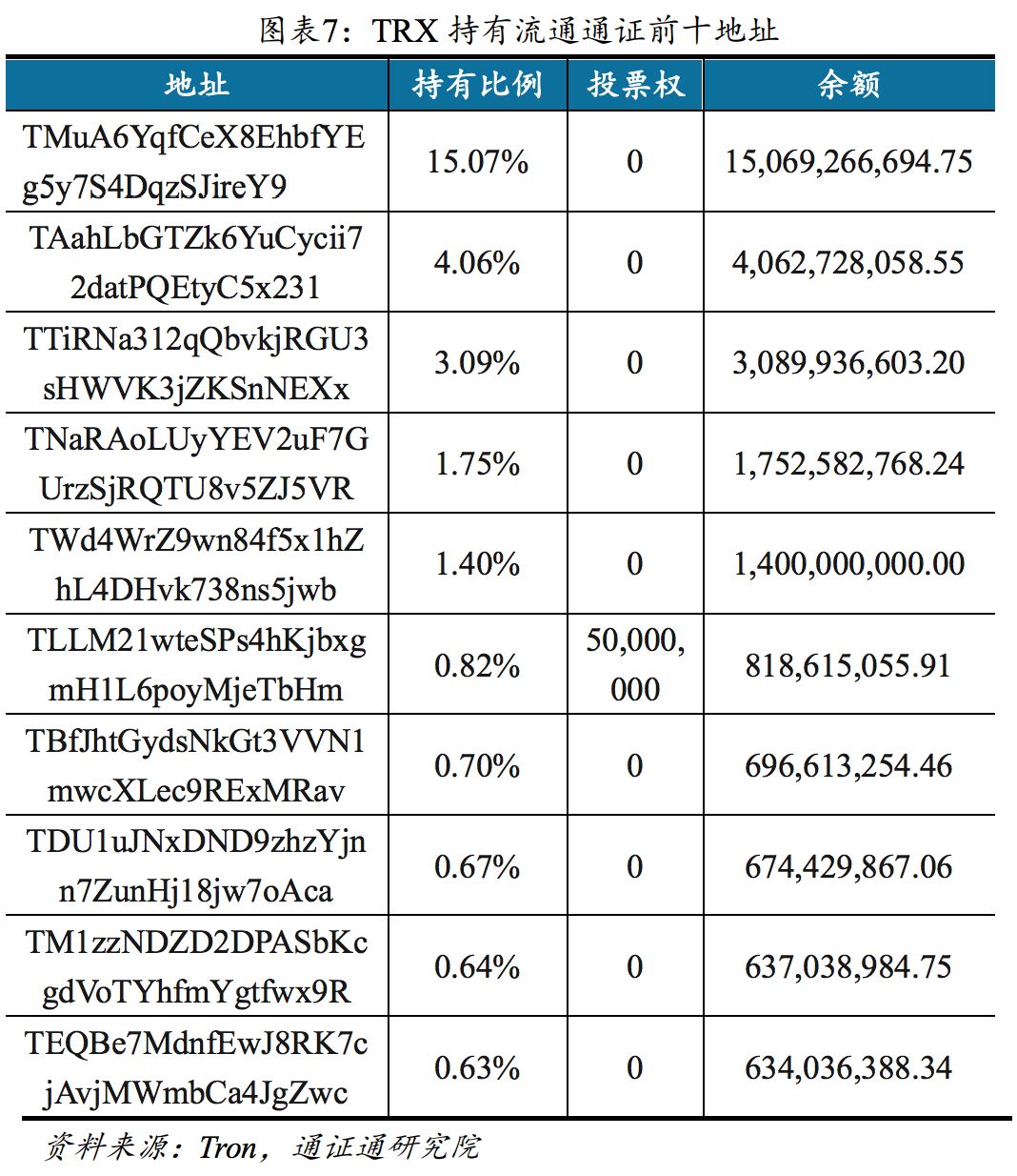 TRX流通中通证的分布较为集中。由于波场在早期众筹后曾因监管原因发起过退币,所以流通通证分布较为集中,持有TRX最多的地址通证数量超过150亿个,存在控盘风险。