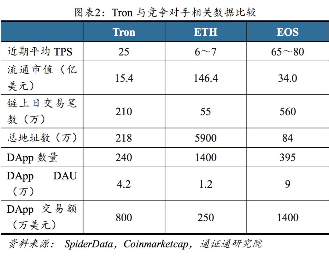 将波场与ETH、EOS的链上数据进行对比,可以发现,同样采用DPoS的波场平均TPS低于EOS,但明显高于ETH。ETH链上的DApp数量虽然最多,活跃用户与交易额却不及EOS与波场。分析表中数据可以发现,公链DApp的活跃用户、DApp交易额与公链性能(TPS)大致成正比关系,因此公链DApp用户增长需要基础性能的提升。当前公链领域竞争激烈,性能差距明显,波场面临来自EOS与ETH的强烈竞争压力。