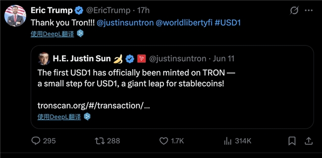 日前,波场TRON区块链迎来历史性一刻:首批1000枚USD1稳定币成功在链上铸造。这一里程碑事件不仅标志着波场TRON在稳定币领域的全新突破,更预示着其作为全球金融基础设施的战略地位进一步巩固。波场TRON创始人孙宇晨通过X平台宣布这一消息,并表示:“这是USD1的一小步,却是稳定币发展的一大步!” 特朗普集团执行副总裁Eric Trump转发了孙宇晨的发文,感谢波场TRON生态对USD1的支持,凸显了此次合作的意义。