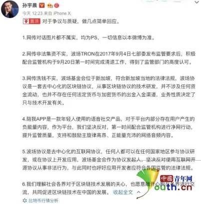 孙宇晨表示,波场币在2017年9月4日七部委发布监管要求后,积极配合监管机构于9月20日第一时间完成清退工作。