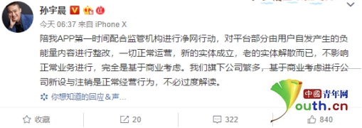 对于“陪我”APP的涉黄指控,孙宇晨表示,“将第一时间配合监管机构进行净网行动,对平台部分用户自发产生的负能量内容进行整改,一切正常运营。”