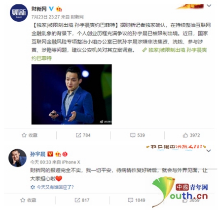对此孙宇晨24日凌晨发微博回应,称财新网报道完全不实,自己一切平安。随后在推特上发布了其在旧金山家中的图片和视频,疑似回应被边控的传闻。